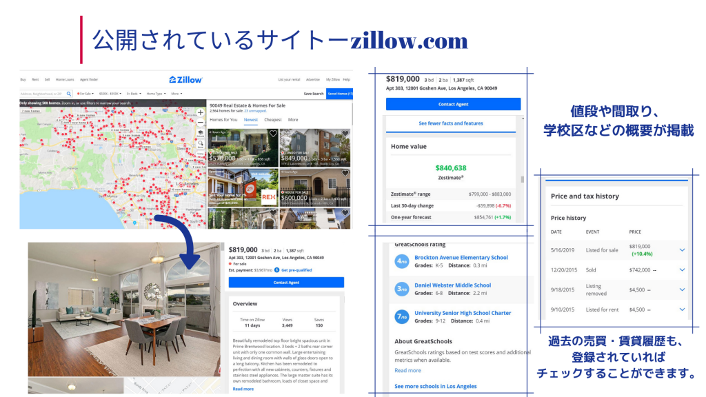 MLSの情報は、上記のようなサイトにもリンク・情報共有されているので、物件に関する主な情報をチェックすることができます。